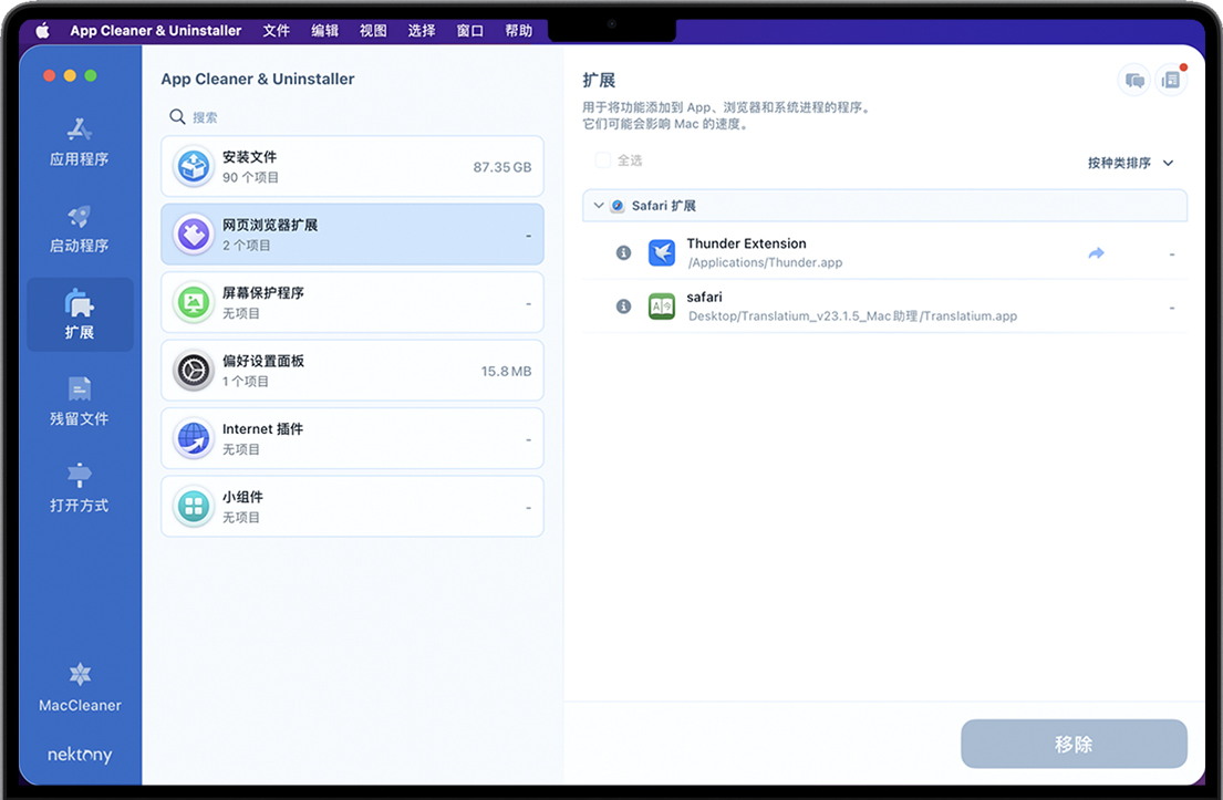 操作Mac上安装的用户和核心扩展。