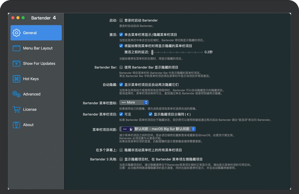 Bartender 4 for Mac 是一款Mac上的菜单栏应用图标管理工具,Bartender 4 是迄今为止最大的更新,专门针对 macOS Big Sur 创建。随着更多令人兴奋的新功能的加入,能够帮助我们删除或者隐藏 macOS 11 Big Sur 系统菜单栏图标的图标,它能够创建一个二级的菜单栏,让我们把不需要直接显示的菜单栏的应用图标放在这个二级菜单栏中,或者直接隐藏,对于崇尚简洁的Mac用户来说,这是一款非常好用的软件!