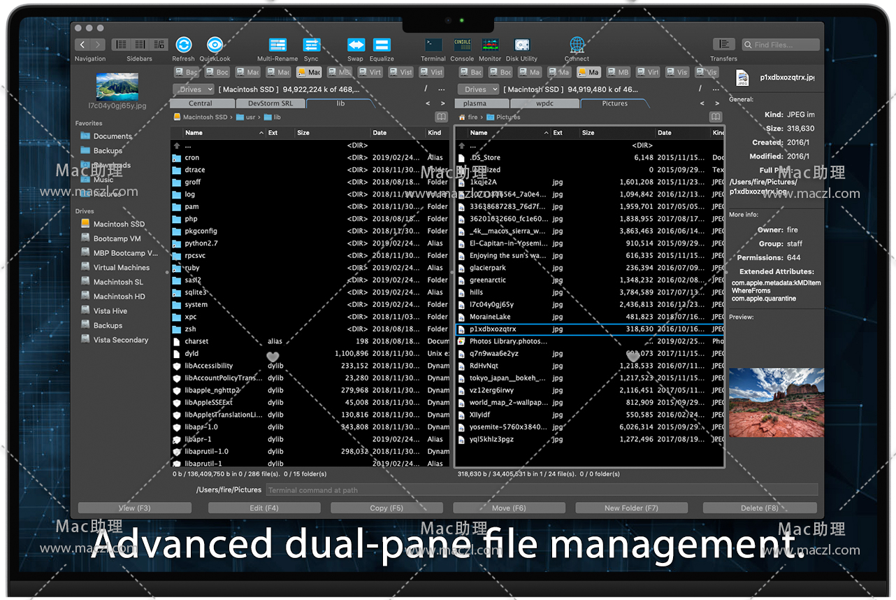 DCommander中的两个面板可帮助您更好地可视化和导航驱动器上的文件交互。结合双侧边栏,它比以往更容易找到喜欢的位置。