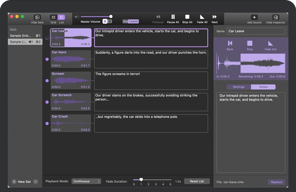 使用检查器来调整每种声音的设置以满足您的需求。设置图块名称和颜色,微调输入/输出点,更改淡入淡出设置等等。