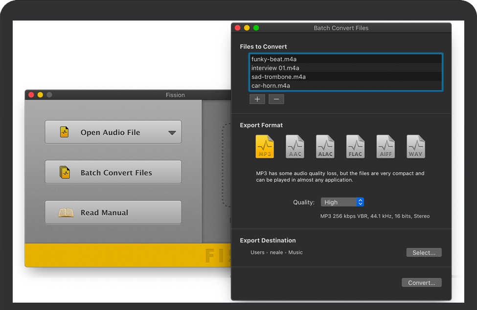 批量转换格式 Fission的批处理转换器可让您一次将数十个文件转换为任何最受欢迎的格式:MP3,AAC,Apple Lossless,FLAC,AIFF和WAV。 更多精彩功能跨格式转换 Fission可以打开的任何文件都可以直接保存到MP3,AAC,Apple Lossless,FLAC,AIFF或WAV。