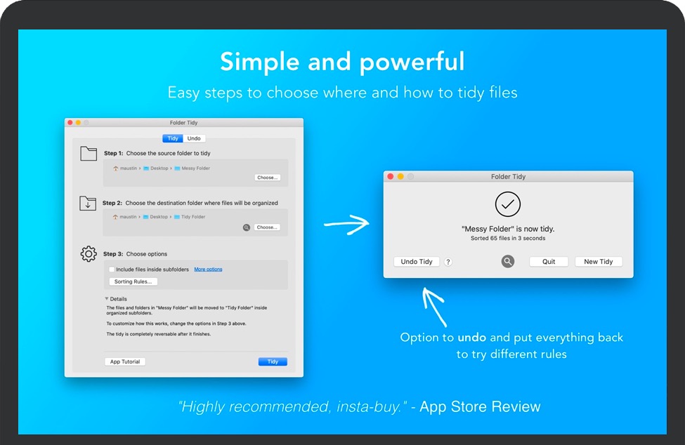 撤消整理的选项始终可用,无论是在完成后还是几天后在撤消列表中。所有文件都将从排序的文件夹中移出并返回到其原始位置。这允许尝试不同的规则和选项,直到整洁正是所需的方式。