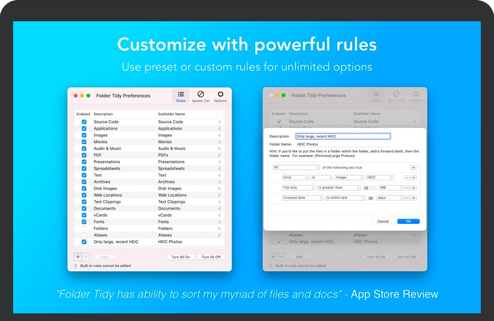 使用自定义规则创建强大的文件排序方式。它们基于谓词,就像 Finder 中的搜索一样。在文件属性上使用多个条件,例如“种类”、“创建日期”、“大小”等。例如:移动所有扩展名为“docx”并包含“发票”一词且最后修改时间为过去 365 天到标有“2020 年发票”的文件夹。每个自定义规则都被保存,并且可以为任何整洁启用/禁用。