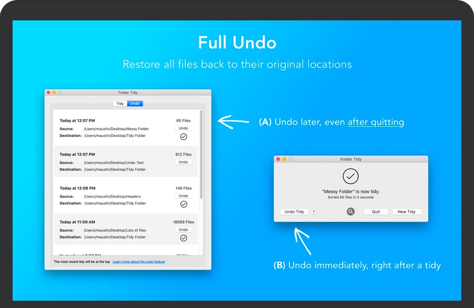 如果事实证明整洁并不完全是您想要的方式,没问题,只需点击撤消按钮,所有内容都将移回其原始位置。它甚至可以在退出完整的旧整理列表后工作,并且可以随时放回所有文件。