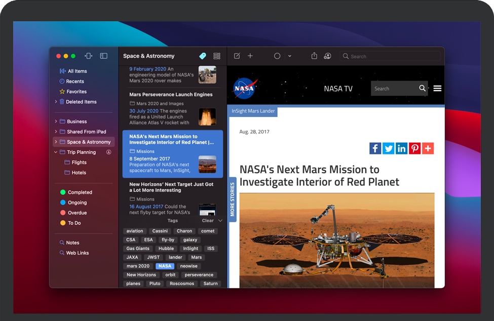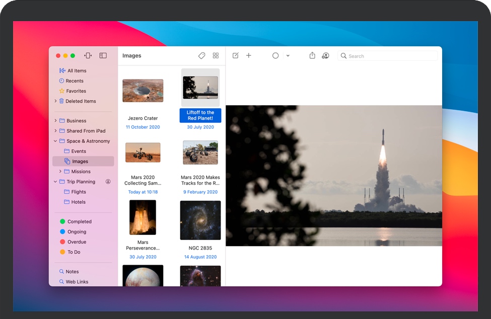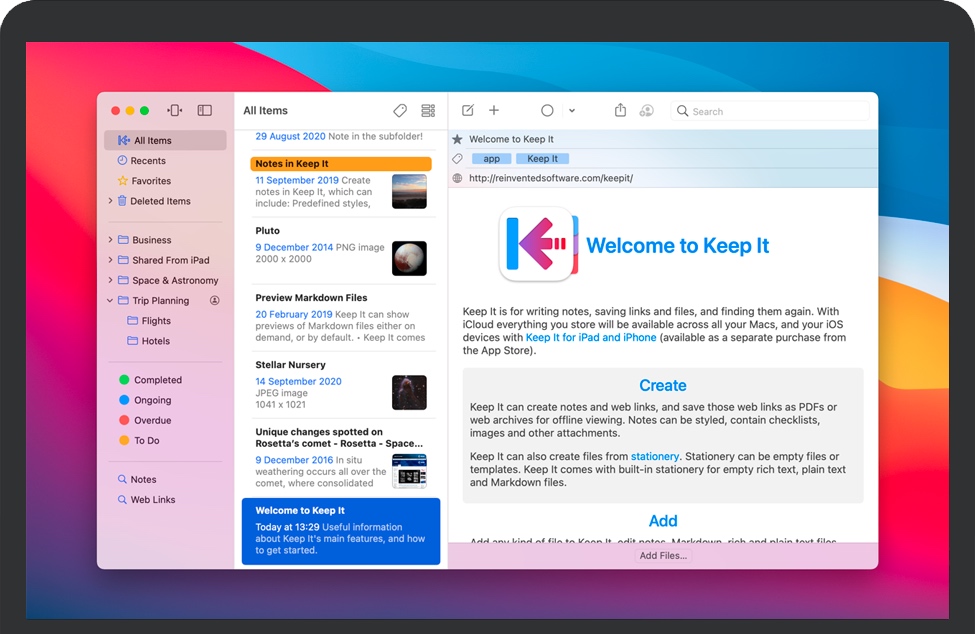 在Mac上可用,并且作为iPhone和iPad上的单独应用程序,使用iCloud可以自动在所有设备上进行更改。保留它是所有您想放到某处的东西的目的地,确信您以后会再次找到它们。