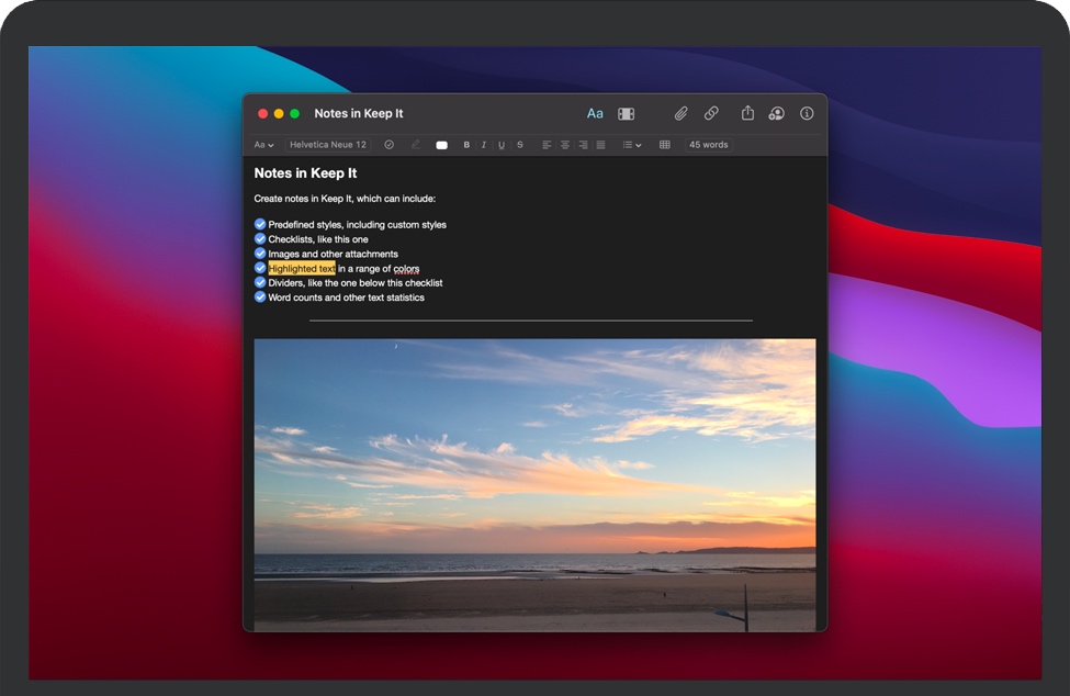 Keep It for Mac 不仅仅是一款mac笔记本应用软件,Keep It还是一款mac文档组织整理工具,非常适合写笔记,保存网页链接,存储文档,图像或其它类型的文件。支持富文本,纯文本和Markdown三种编辑模式,支持PDF编辑(高亮,标记,旋转及删除页面)。