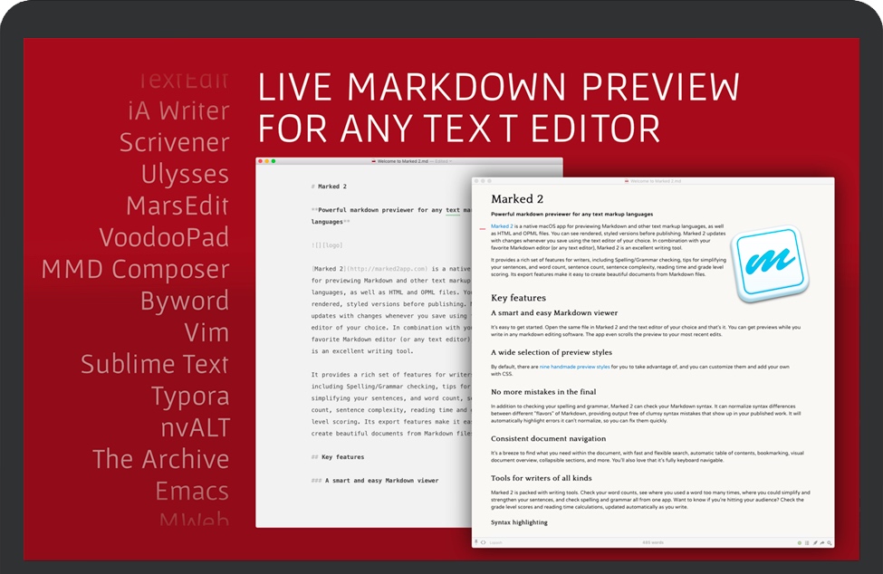 在使用iThoughtsX或MindNode工作时,将思维导图作为文档查看。在使用Ulysses、Scrivener、nvALT、Bear和MarsEdit写作时使用它。此外,它支持Leanpub格式并提供多种语法来合并外部文件。