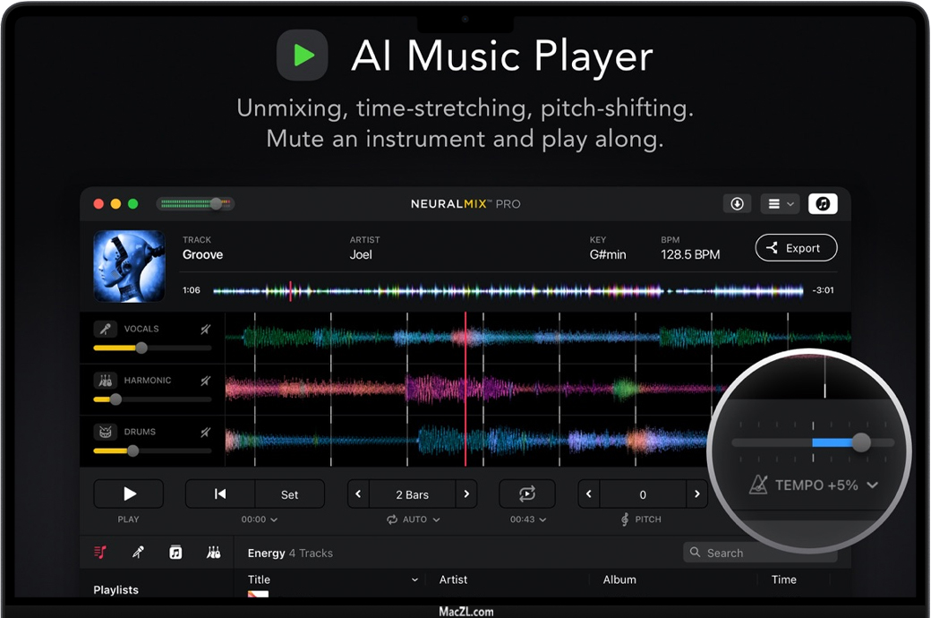 您可以创建节拍精确的循环,改变节奏,并转置歌曲的关键,同时实时删除人声、打击乐或和声部分。高级离线导出允许您自动提取无伴奏合唱和乐器,以用于您最喜欢的DJ或音乐制作软件。
