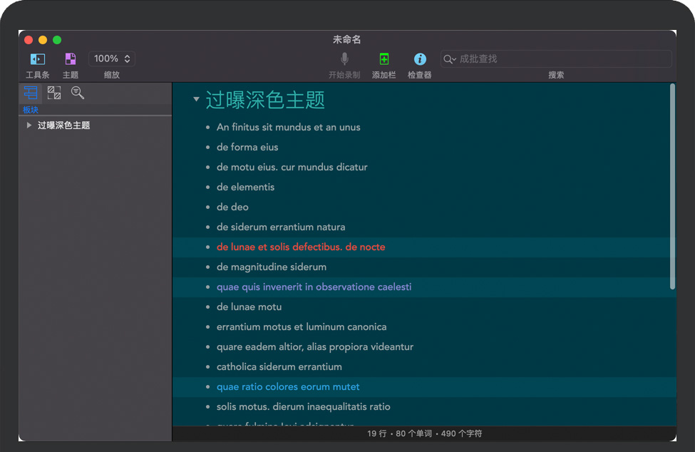 ·暗黑模式:OmniOutliner 的 UI 会适应您的文稿主题的背景颜色。