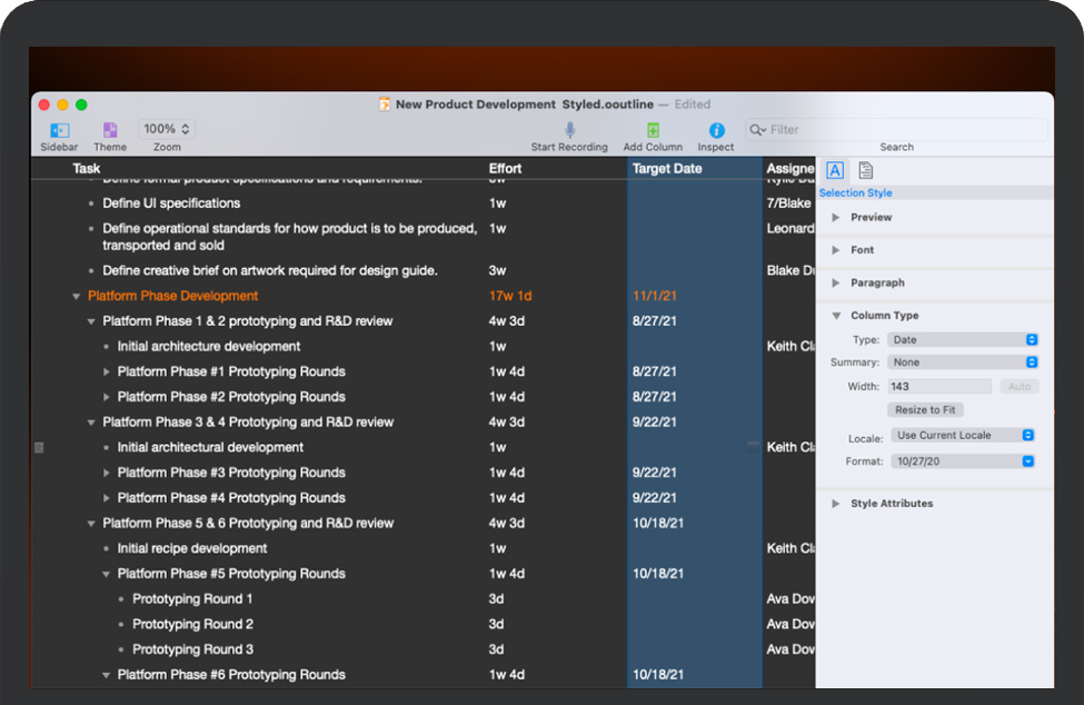 ·调整列大小以适应:选择一列,然后使用列类型检查器中的调整大小以适应按钮,让 OmniOutliner 调整宽度以适应内容。