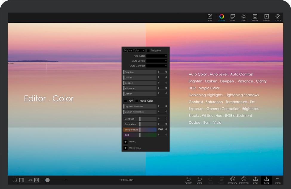 -编辑(Editor):颜色和亮度调整,白平衡,背光修正,加边框,气泡提示,马赛克,添加文字,绘画图片,剪裁,缩影,人像美容,高动态范围,去雾,3D效果,镜头校正,去红眼,液化,污点修复画笔,仿制图章
