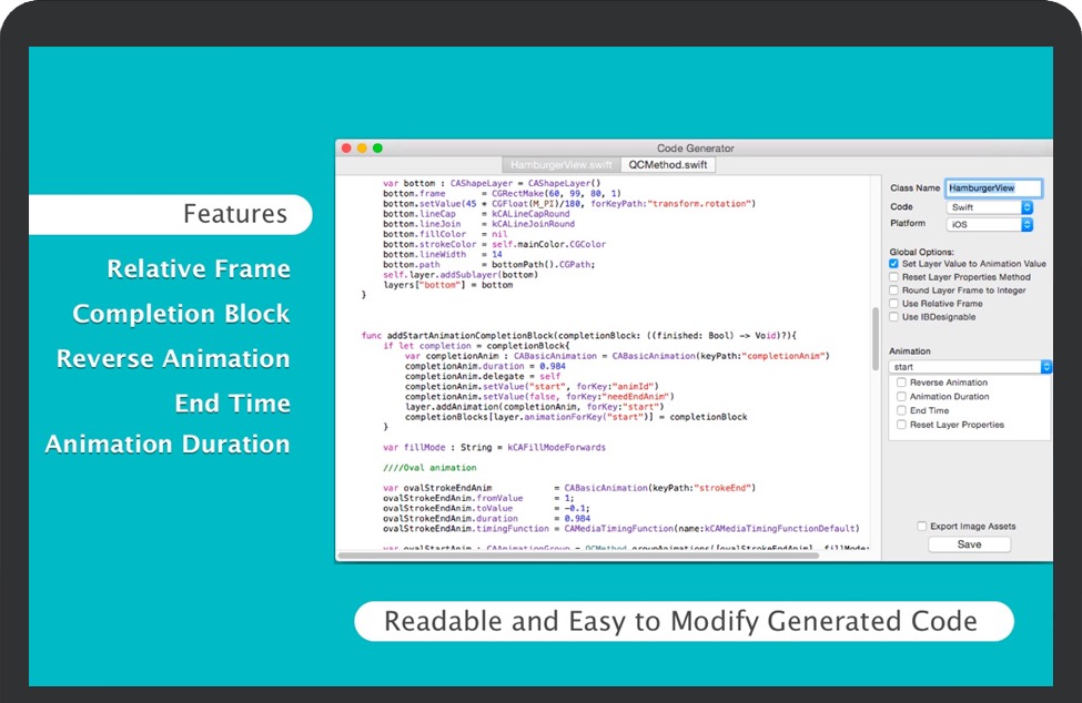 QCode是一种快速,轻巧且功能强大的动画工具,可将矢量绘图和动画转换为Objective C和Swift代码。