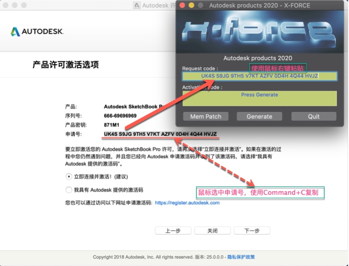 如下图,选择软件激活界面上的 “申请号” ,选中后用快捷键command+c拷贝(只能使用快捷键Command+C复制)。然后用鼠标右键的粘贴到注册机上的 “Request code:” 框里(这里的粘贴只能用鼠标右键,快捷键用不了)!