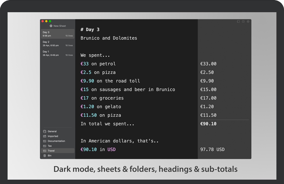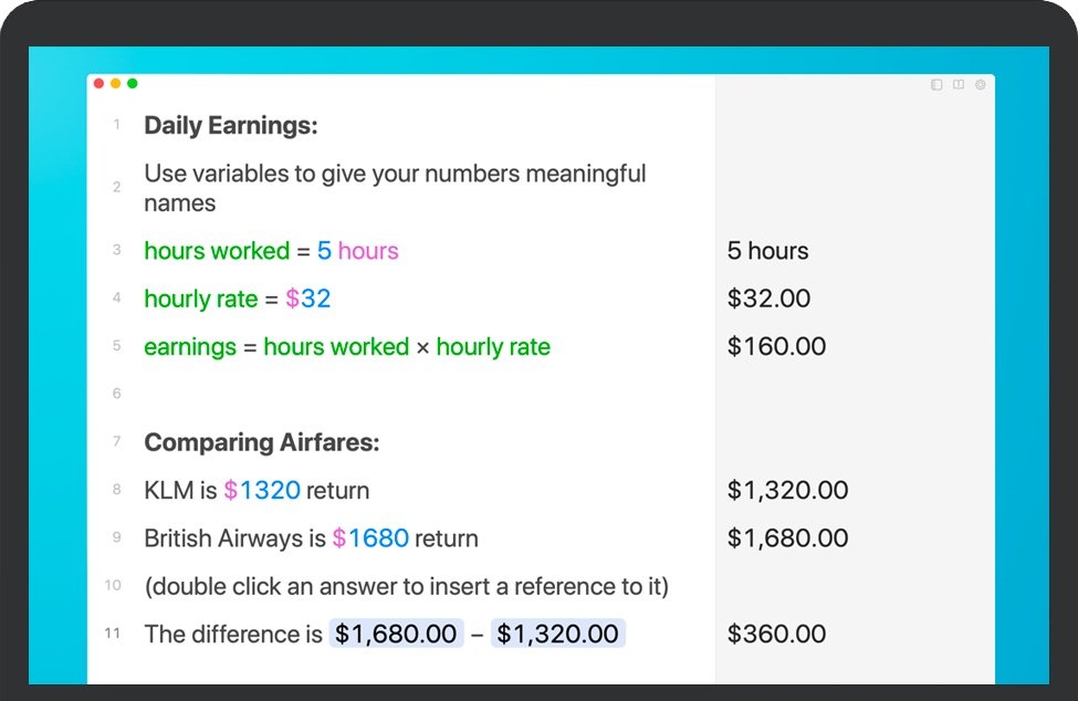 在多行的计算算式中,可以如同试算表一般灵活引用数据,加总计算、百分比计算,对于Soulver都只是小菜一碟。不仅如此,诸如货币之类的单位转换也是Soulver的拿手绝活,效率完胜试算表,更远比传统计算器来得智能。