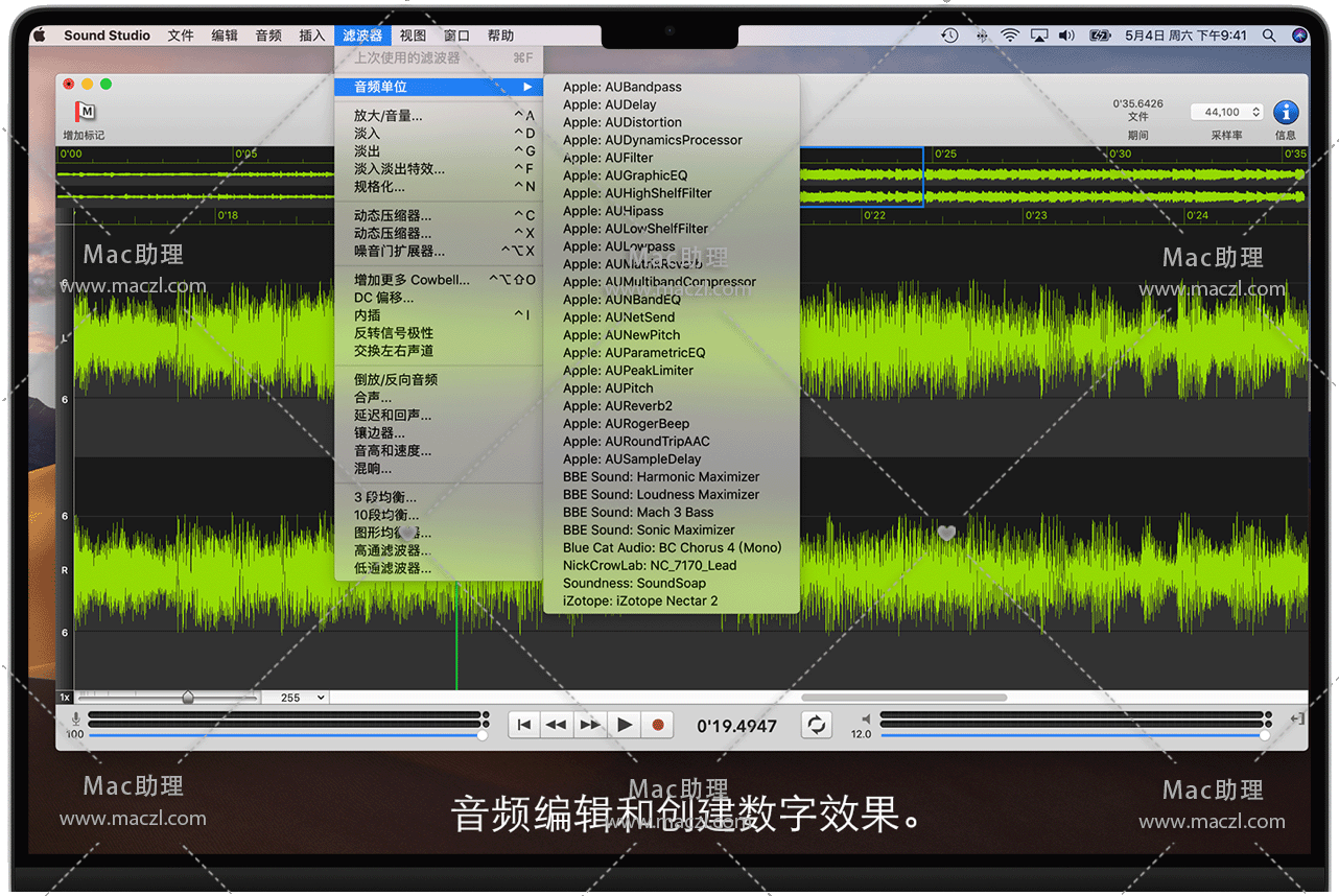 调整音量和均衡器,应用数字效果,并保存为所有主流文件格式。使用 Automator 或 Applescript 批量处理文件。