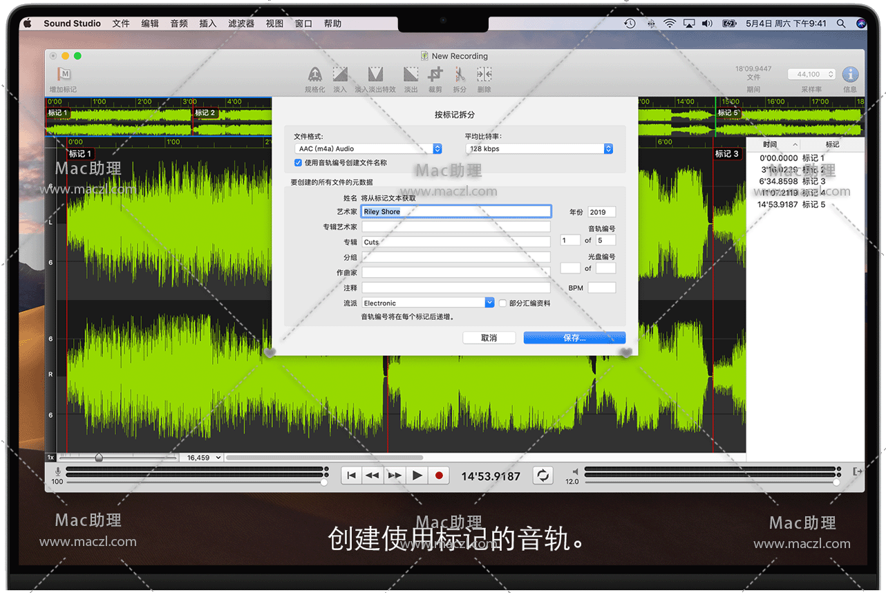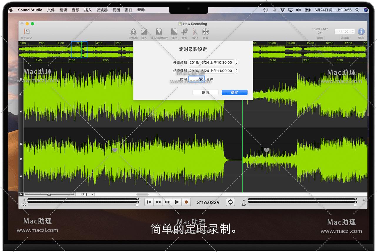Sound Studio 是一款简单易用的苹果机应用程序,可用于在计算机上录制、编辑和制作数字音频。Sound Studio 可用于实现磁带和黑胶唱片的数字化,为现场演出录音,使用淡入淡出功能制作您自己的混音,调整音量及平衡,添加数字化效果以及用各种主流文件格式保存音频。