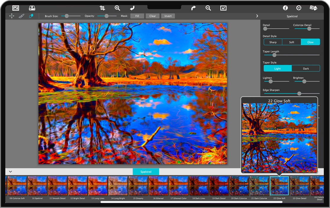 包括一个插件,允许从Photoshop、Elements、Lightroom 和 PaintShop Pro内部快速访问 Spektrel Art。支持动作、透明度、混合、最后过滤命令、批处理和 16 位 RGB/灰度模式。