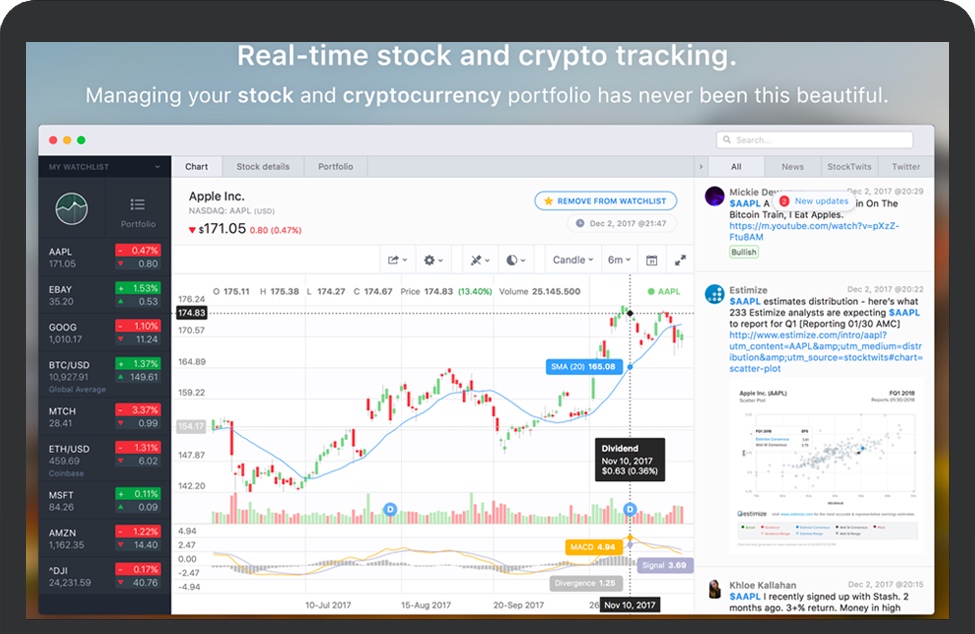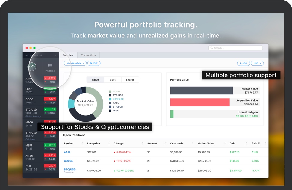 Stockfolio for Mac 是一款适用于macOS的投资应用程序,可让您研究和跟踪有趣的股票和加密货币,从而帮助您提高投资回报。它非常容易设置,并且是管理和跟踪投资组合的最佳方法。