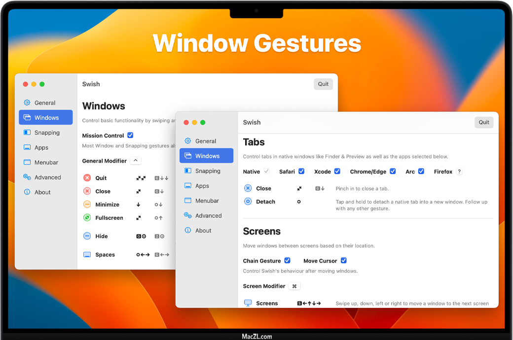Swish for Mac 是一种基于手势的 Windows 控制器开发的Mac触控板增强,可扩展触控板的功能。在多屏幕设置中使用直观的两指移动来管理窗口和应用程序。轻扫、捏合、点按并按住以充分利用触控板。Swish 又不仅仅只是一个窗口管理器,Swish具有28个易于使用的标题栏,停靠栏和菜单栏手势,可增强您的工作流程,并使您成为触控板的高级用户。