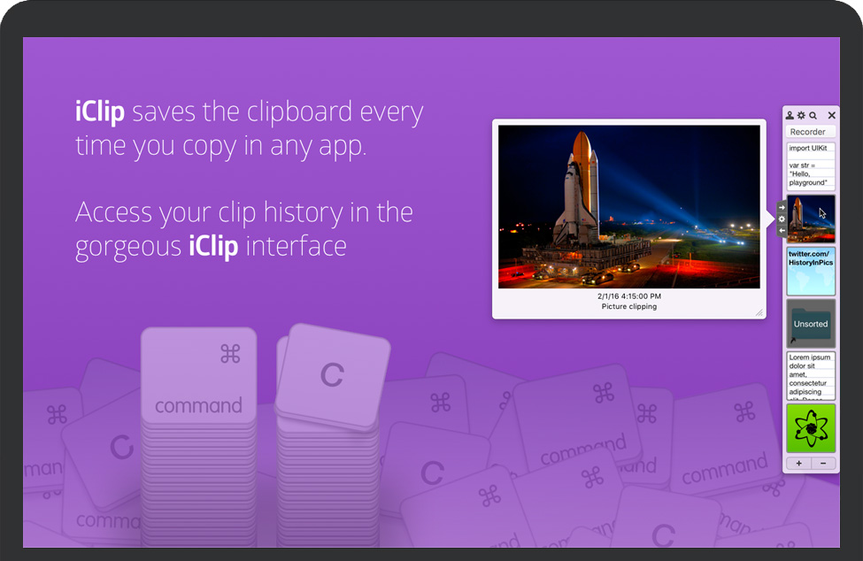 每当您复制纯文本,富文本格式,图像,文件或其他任何内容时,iClip都会保存剪贴板的内容。在华丽的iClip界面中访问您的剪辑历史记录。