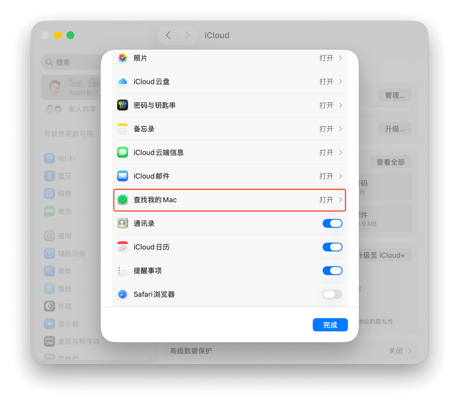 1. 前往「系统设置 > Apple ID > iCloud」,找到并点击「查找我的 Mac」。在弹出的窗口中,确保其处于开启状态。强烈建议同时开启「『查找』网络」选项,以便设备在离线时也能被定位。