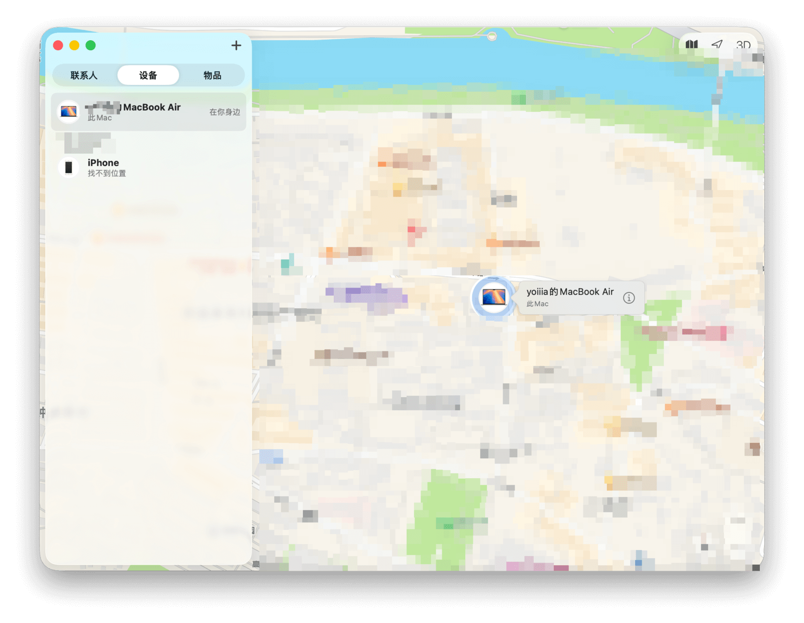 打开「查找」应用,在「设备」和「物品」标签页中,会以列表形式显示所有关联到你 Apple ID 的设备和物品,以及它们的最后更新位置与时间。