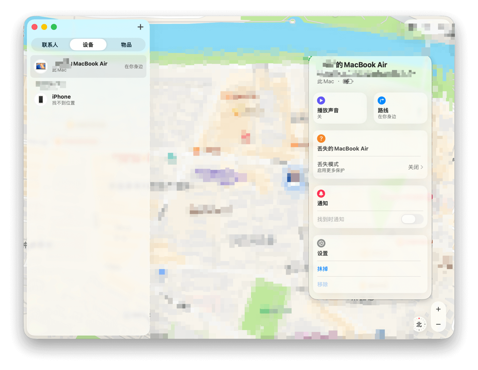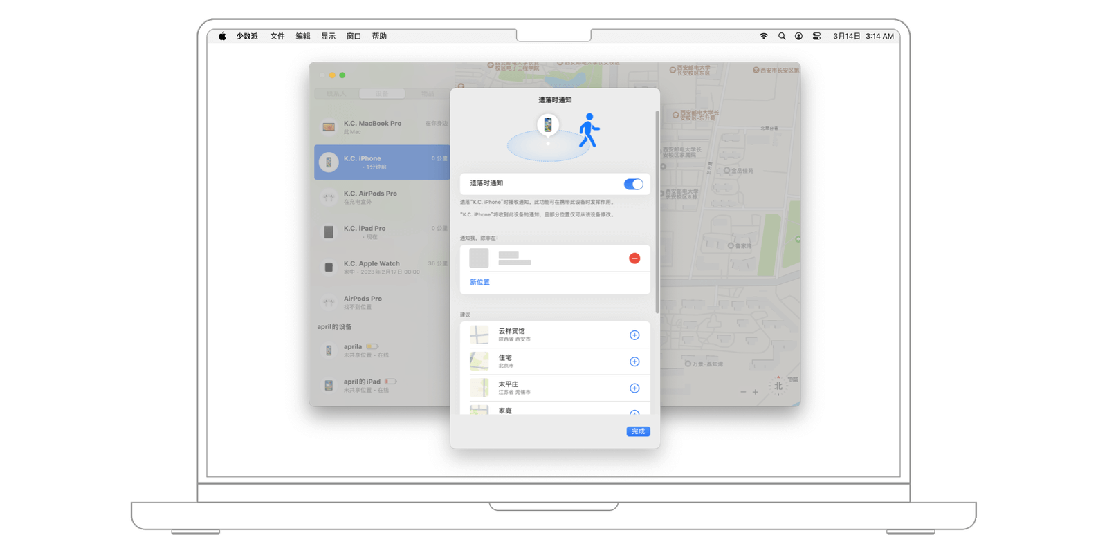 「查找」应用最核心的功能,自然是帮你找到设备。无论是设备就在附近找不着,还是确认已经丢失,你都可以通过它进行定位、设为「丢失模式」或远程「抹掉此设备」,以保护个人信息。此外,你还能设置「遗落时通知」,防止因遗忘而造成设备丢失。