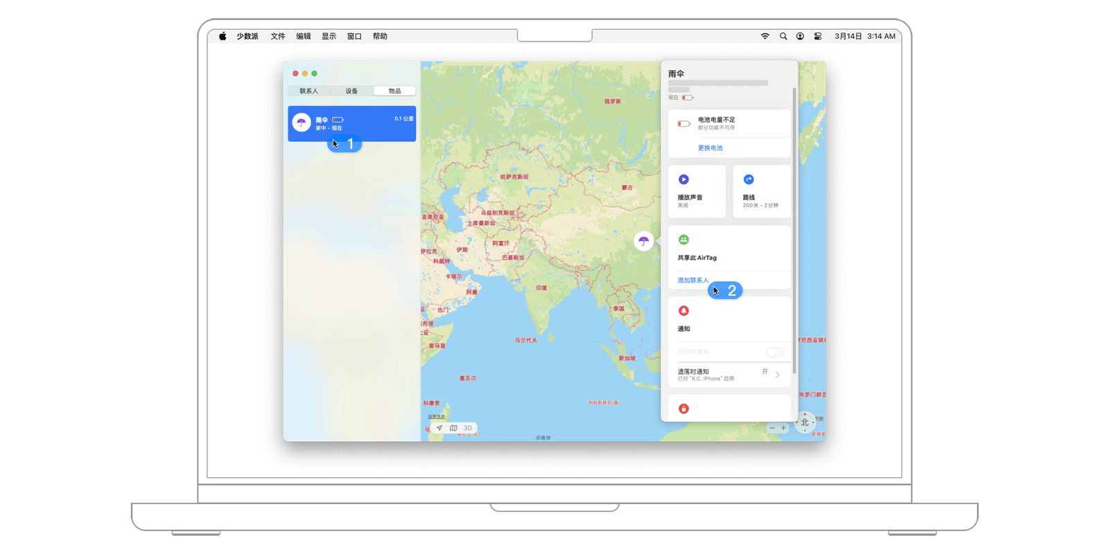 你还可以与亲友共享 AirTag 或其他支持「查找」网络的物品。在「查找」应用的「物品」视图中,选中要共享的 AirTag,点击「i」按钮,在详情窗口的「共享此 AirTag」下方点击「添加联系人」,即可邀请他人共享。