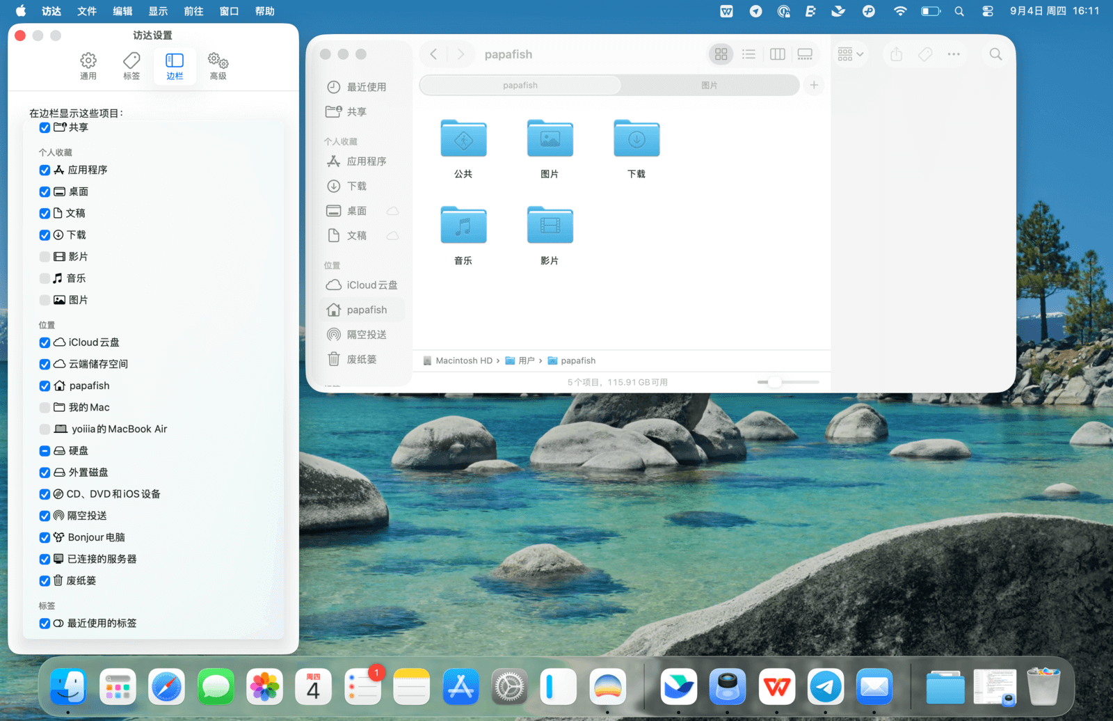 此外,「个人收藏」中还有许多系统自带的快捷访问项,如「桌面」「下载」等。你可以在「访达」→「设置…」→「边栏」中自定义要显示的内容。