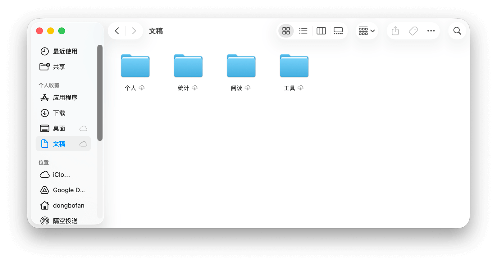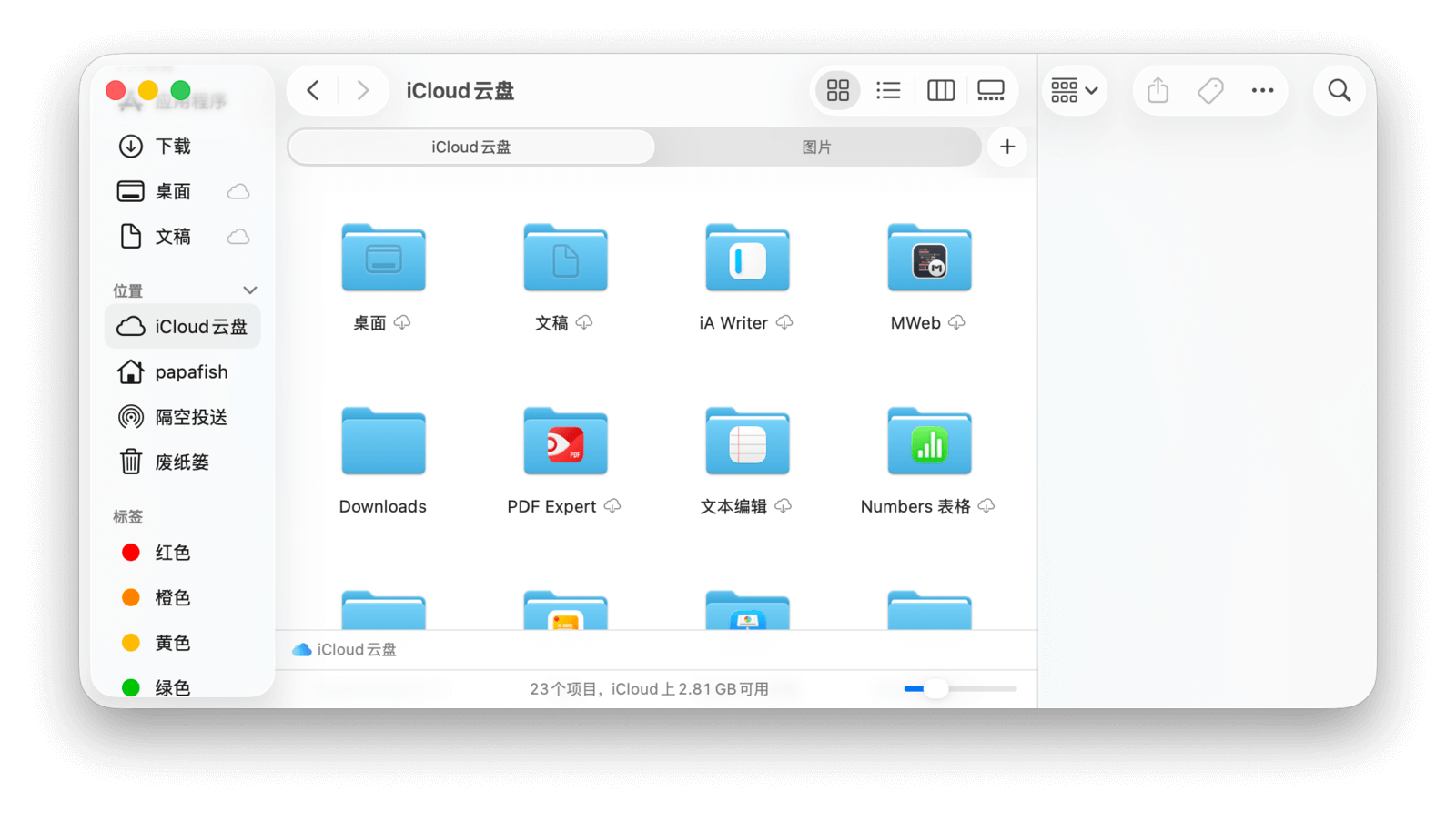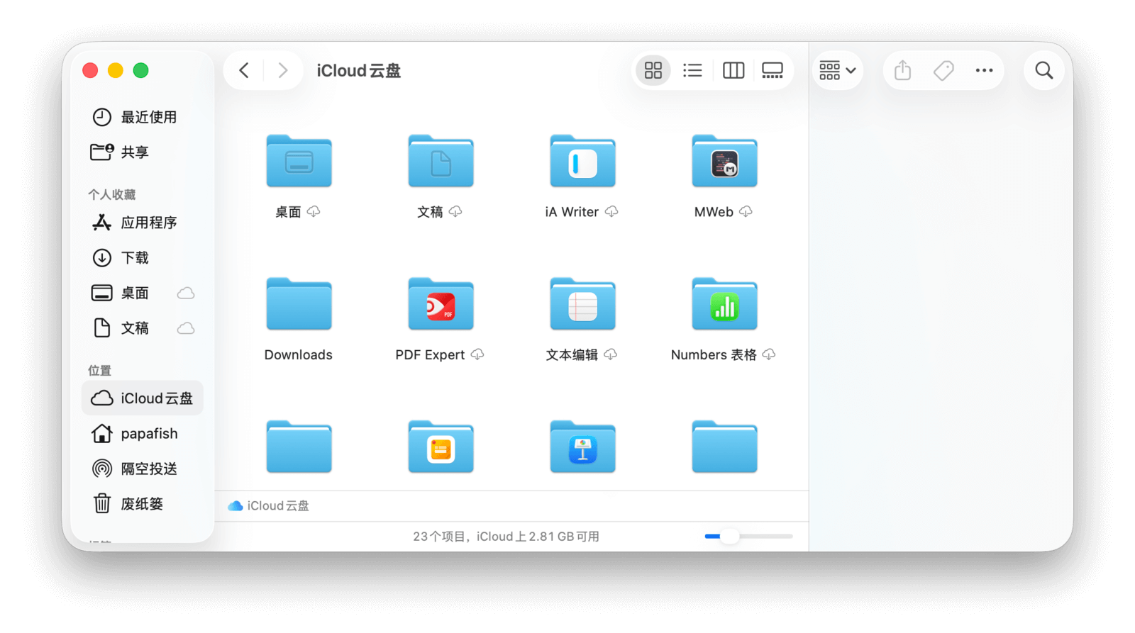 在「访达」边栏的「iCloud」类别下,可以找到「iCloud 云盘」,这里存放着所有储存在 iCloud 中的文件。