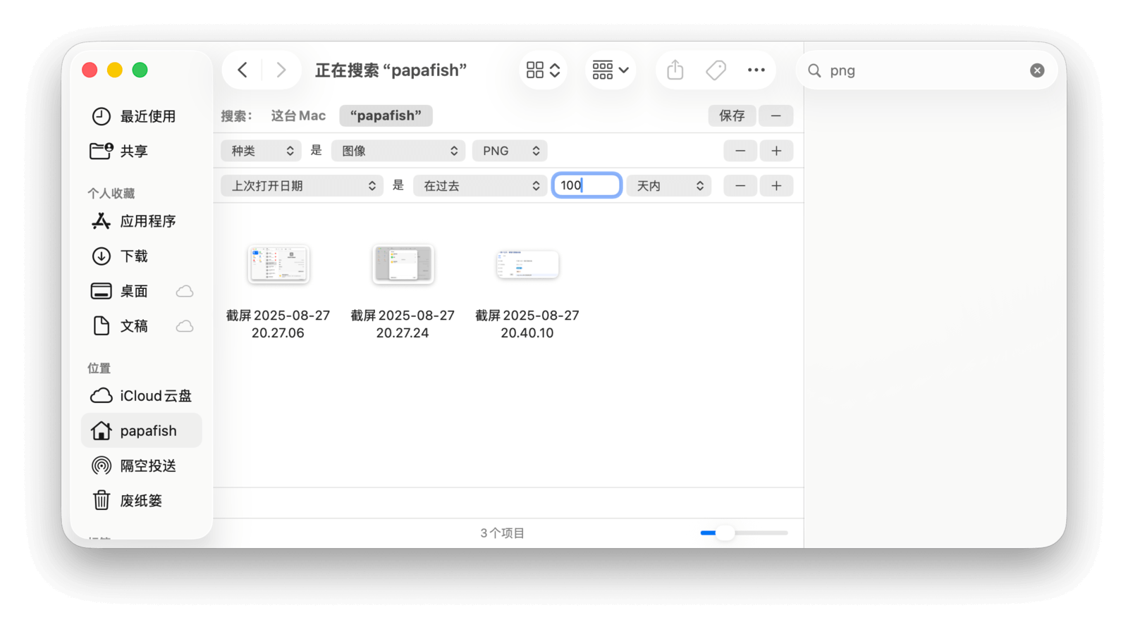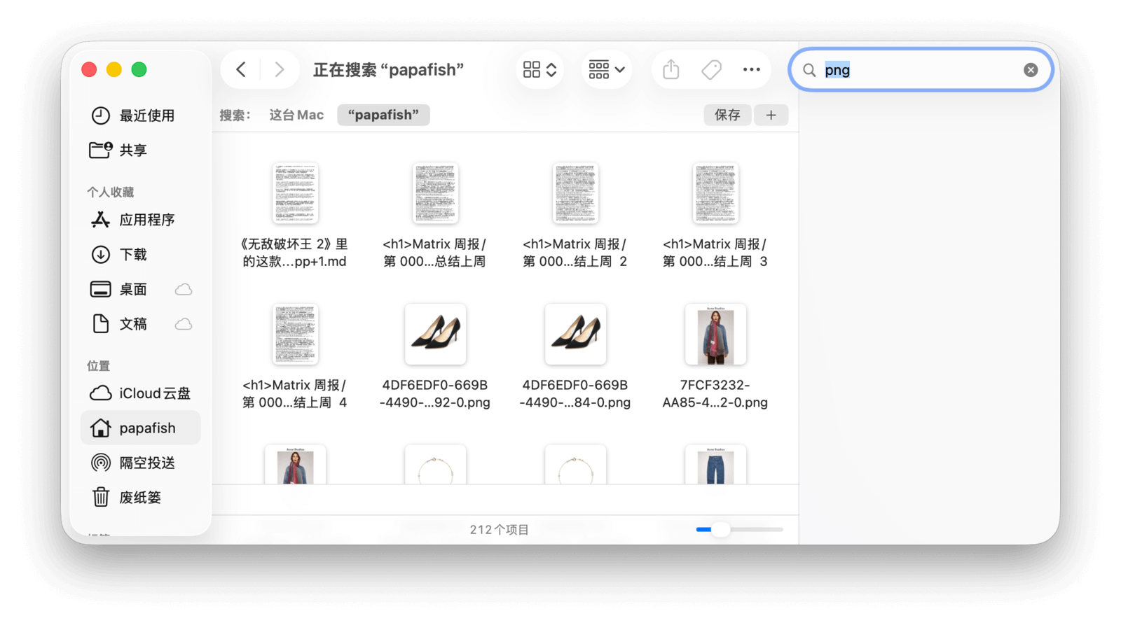 默认情况下,搜索范围是「这台 Mac」。如果想在当前文件夹中搜索,可以点击工具栏下方的文件夹名称进行切换。