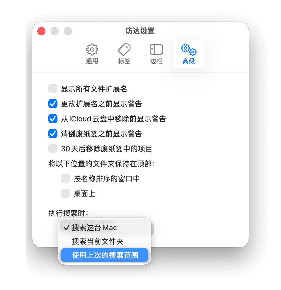 你可以在「访达」的设置中更改默认的搜索范围。如果勾选「使用上一次的搜索范围」,「访达」就会记住你上次的选择。