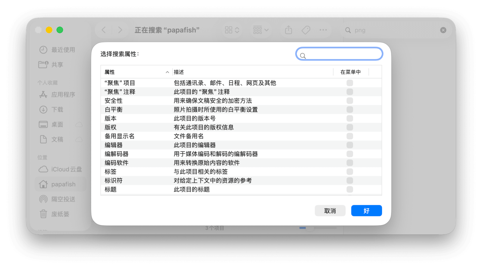 macOS 提供了几十项搜索属性,涵盖了文件的方方面面。默认只显示少数几项,你可以在属性列表最下方的「其他…」中自定义需要显示的项目。对于日常搜索,组合使用系统提供的这些选项已经足够了。