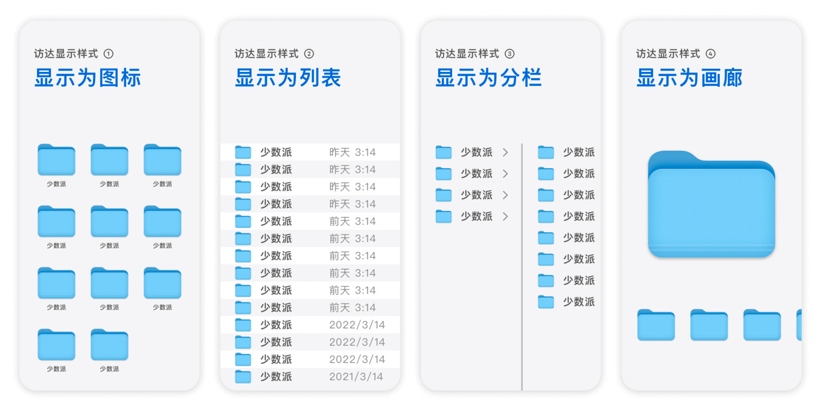 在「访达」→「显示」菜单中,你可以设置文件的显示样式,共有四种:「图标」「列表」「分栏」和「画廊」。它们各有特点,你可以根据当前文件夹内容的性质来选择。例如,查看图片时可选「画廊」以获得更大的预览;需要清晰展示层级关系时,「分栏」则是最佳选择。