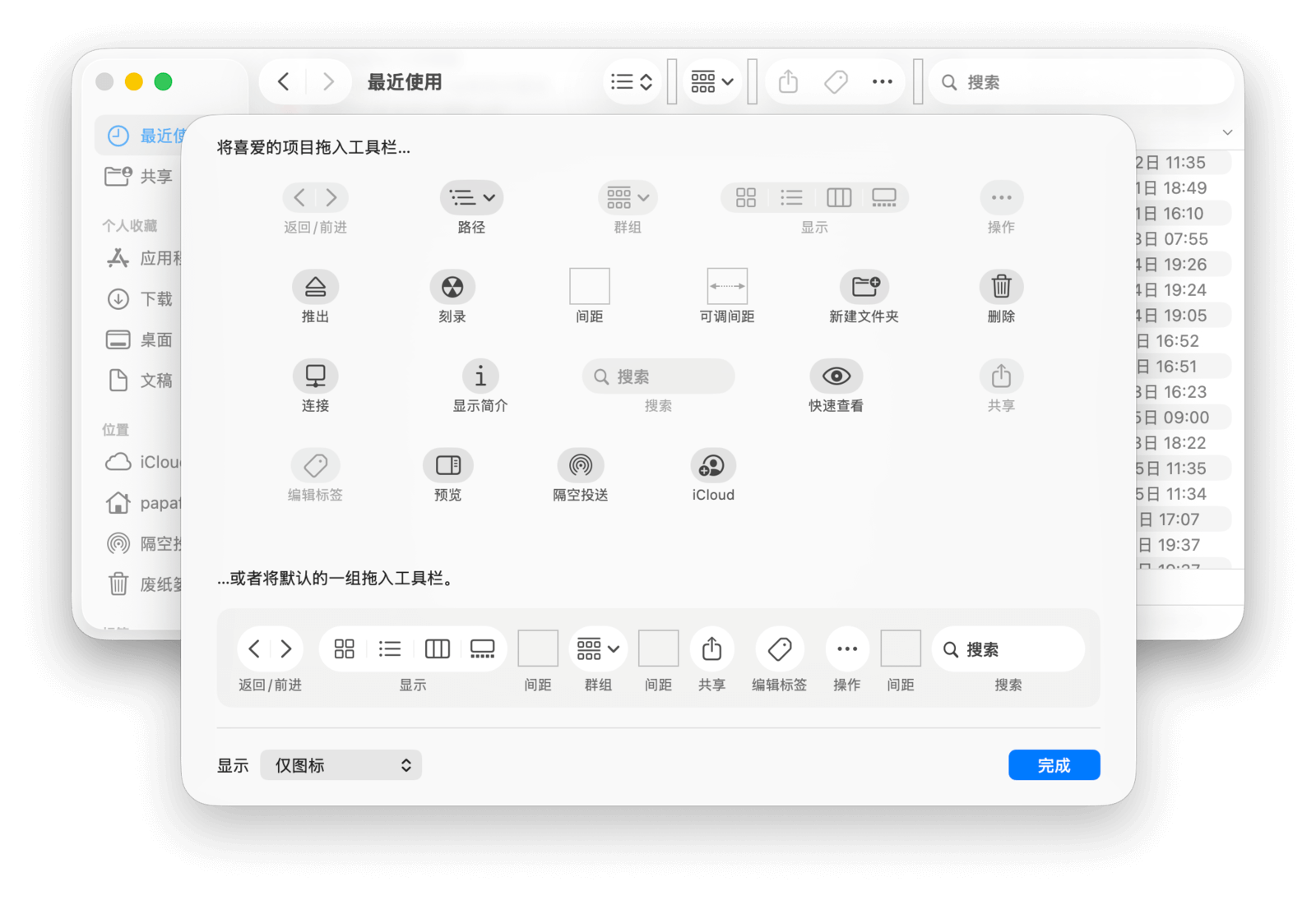 如果你对默认的工具栏布局不满意,可以选择「访达」→「显示」→「自定工具栏…」,拖拽你需要的按钮到工具栏上,也可以在这里选择工具栏的显示样式(图标、文字或图文并茂)。