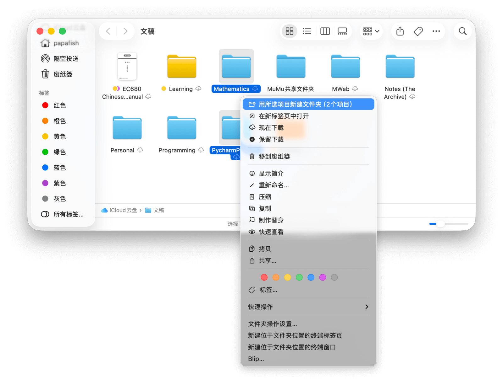 如果你想将多个文件或文件夹打包放进一个新文件夹,可以同时选中它们,然后点击菜单栏「文件」→「用所选项目新建文件夹」。