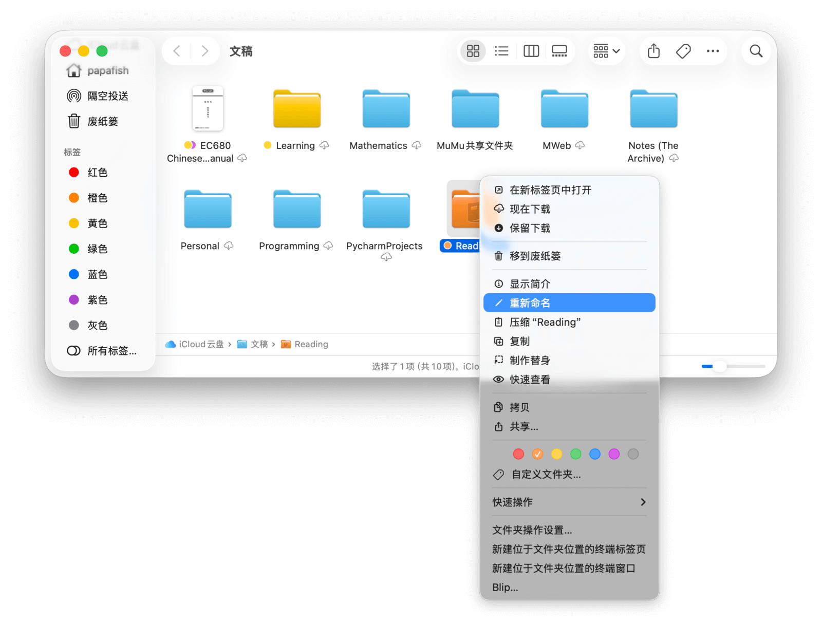 你可以在「访达」→「设置…」→「标签」中对标签进行增减、重命名和更改颜色等管理。