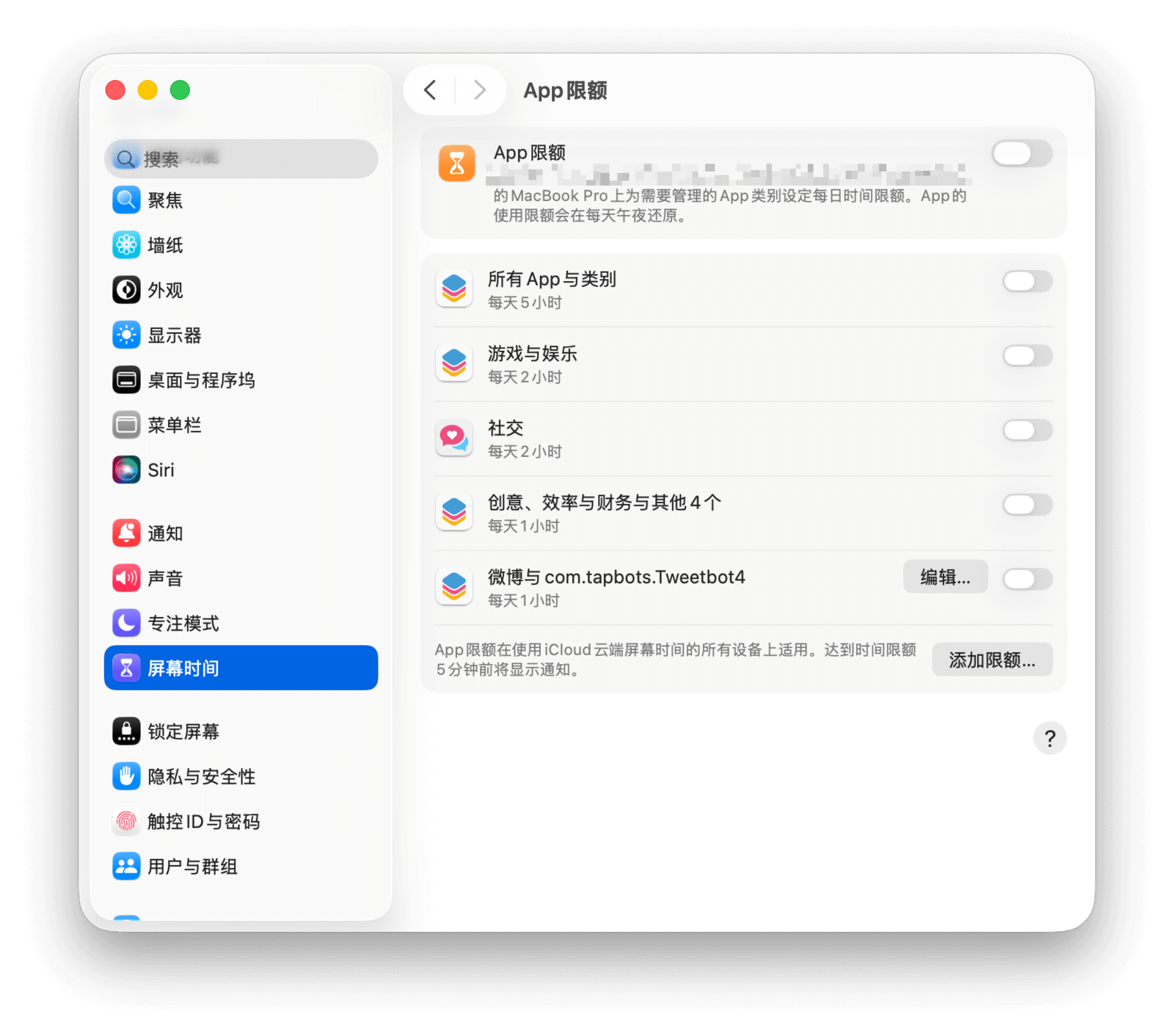 如果你设置了包含所有应用的「App 限额」或开启了「停用时间」,那么 Mac 上的所有应用都将被限制。