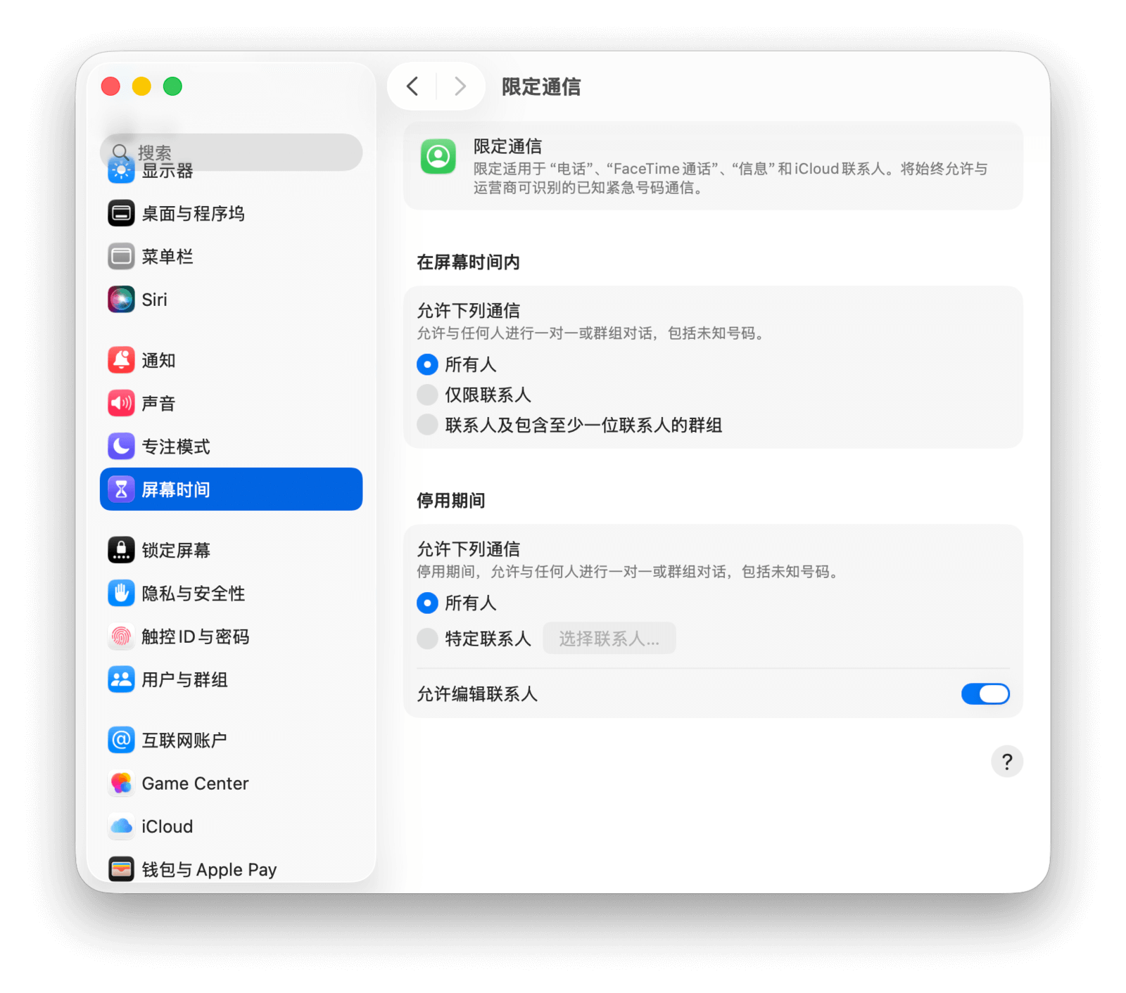 前往「系统设置 > 屏幕使用时间 > 限定通信」,你可以设定规则在屏幕使用时间内始终生效,或仅在「停用时间」内生效。选定后,即可从通讯录里挑选允许与你联系的对象。