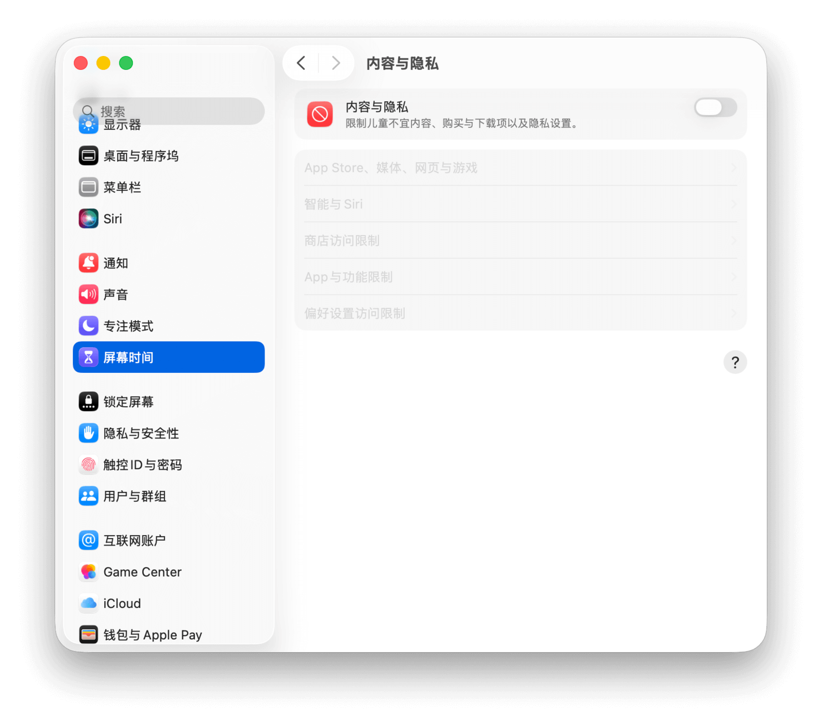 如果你想限制使用 Mac 的用户访问某些应用或内容,可以在「系统设置 > 屏幕使用时间 > 内容与隐私」中开启此功能。它提供了种类繁多的限制,例如禁止安装或删除应用、停用系统应用、限制定位和蓝牙权限等。