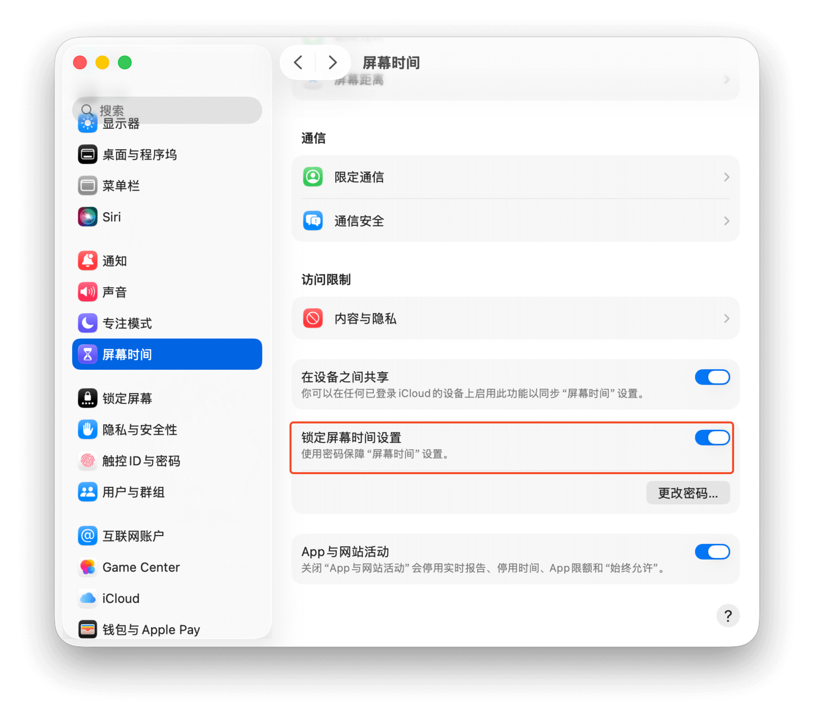 「屏幕使用时间」允许用户设置密码。前往「系统设置 > 屏幕使用时间」,启用「为屏幕使用时间设置密码」即可。设置后,在忽略限额或更改设置时,都需要通过密码验证。