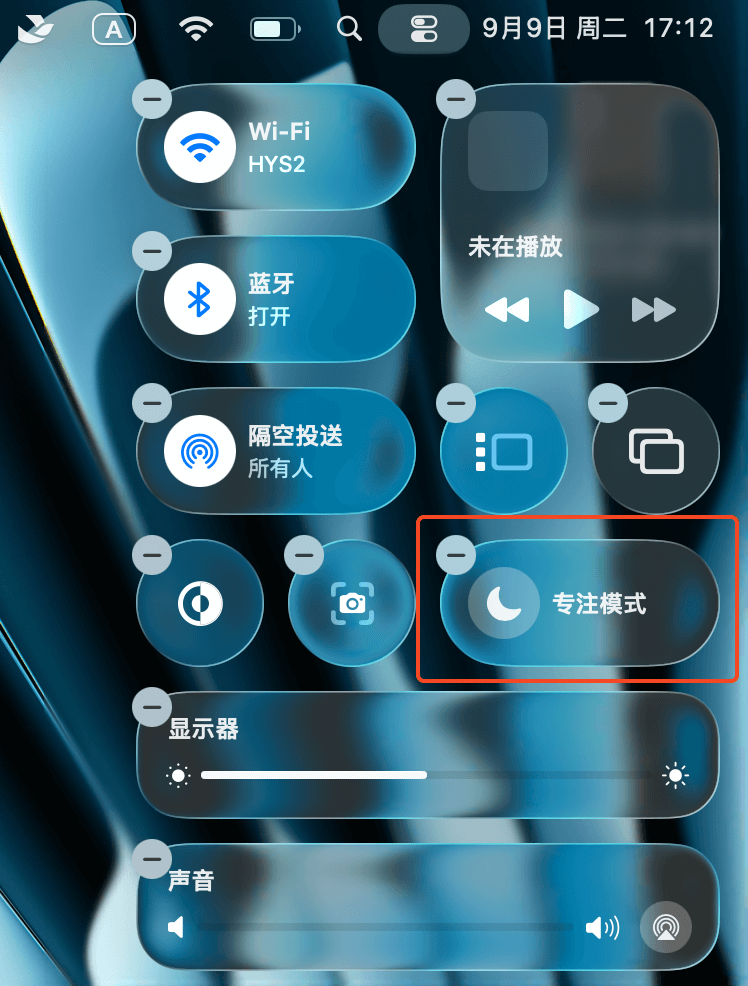你可以在「控制中心」的「专注模式」面板中打开或关闭想要的模式。开启后,状态栏会显示相应的图标,提示当前的专注状态。你也可以直接点击状态栏上的图标,来快速切换到其他模式。