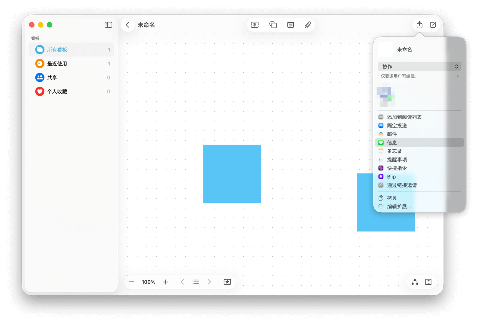 同样,在使用前请确保已在「系统设置 > Apple ID > iCloud」中启用无边记。然后,在任意画布的右上角找到分享按钮,就可以通过信息、邮件等方式邀请协作者加入当前的画布。