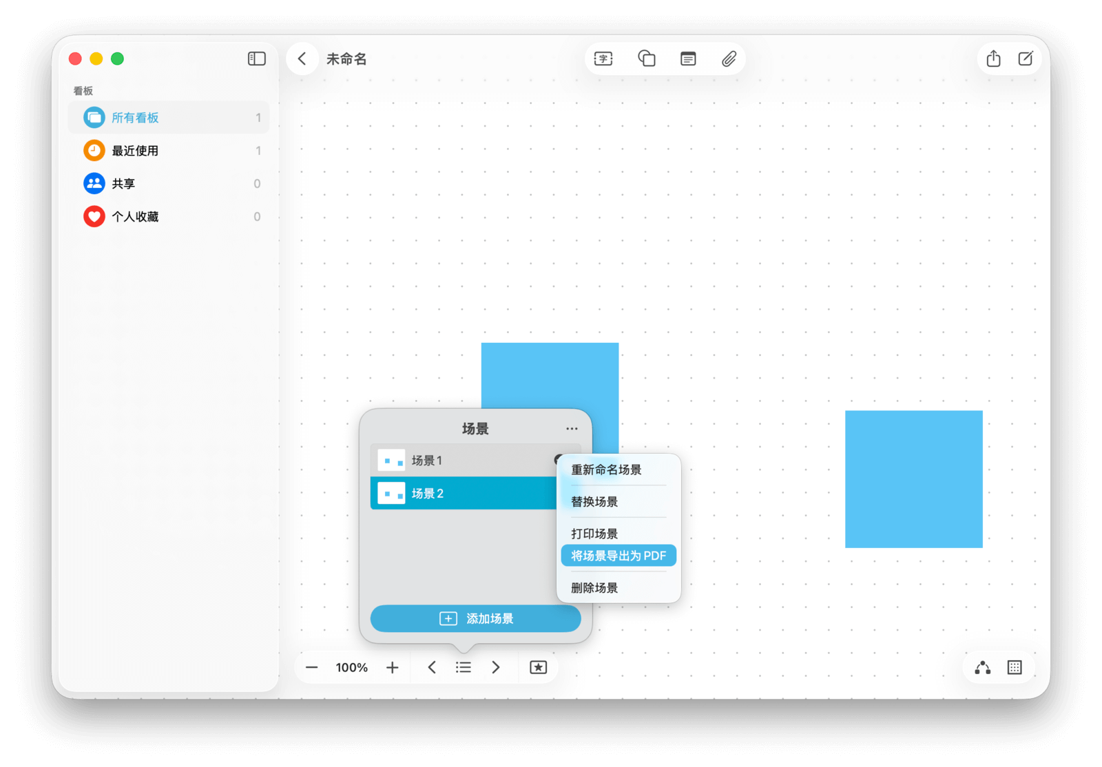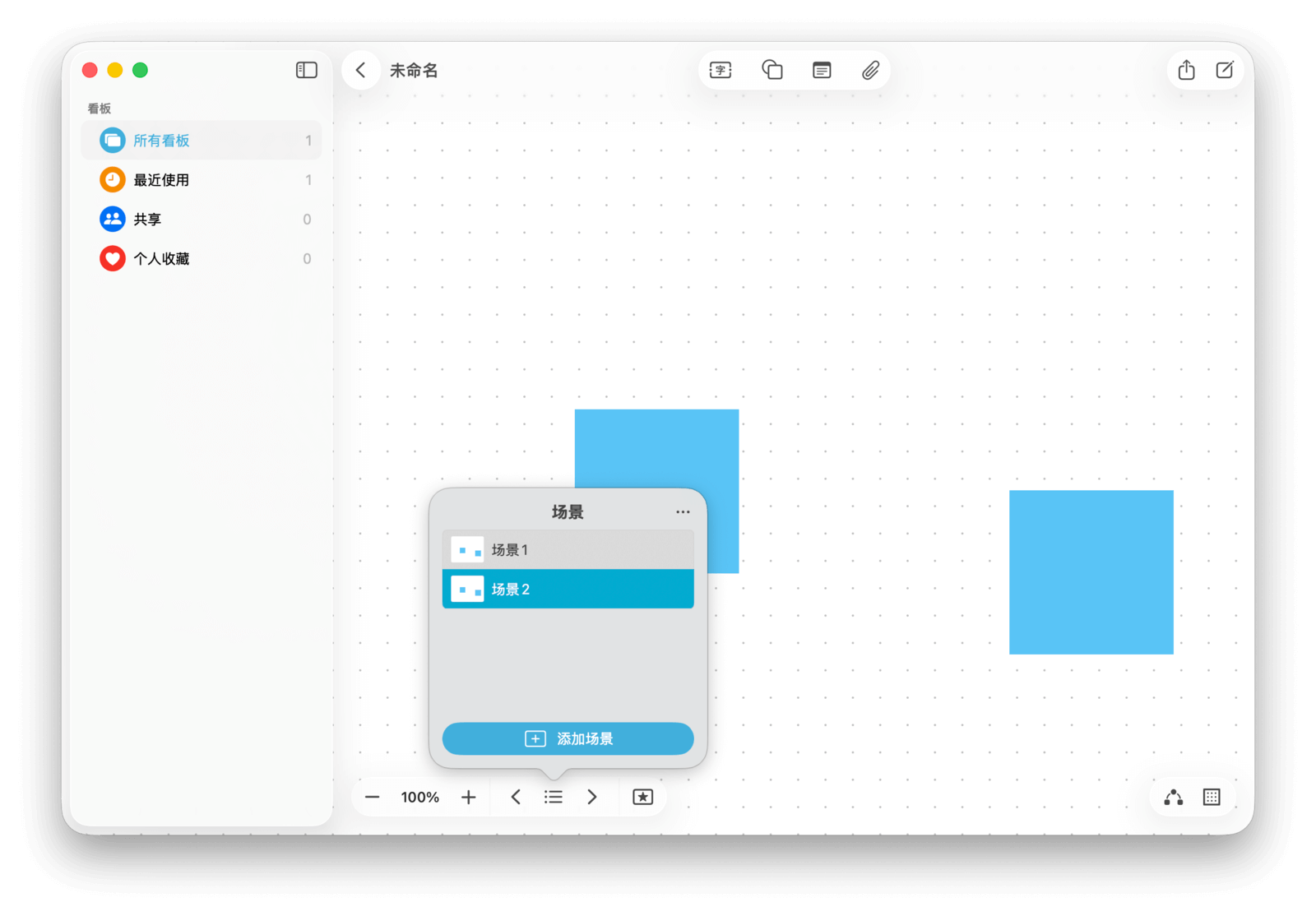 点击画布左下角的场景导航器按钮,即可展开「场景列表」。在列表中点击「添加新场景」,即可将当前画布区域添加。完成添加后,你可以重命名场景,也可以直接拖动列表中的场景来重新排序。