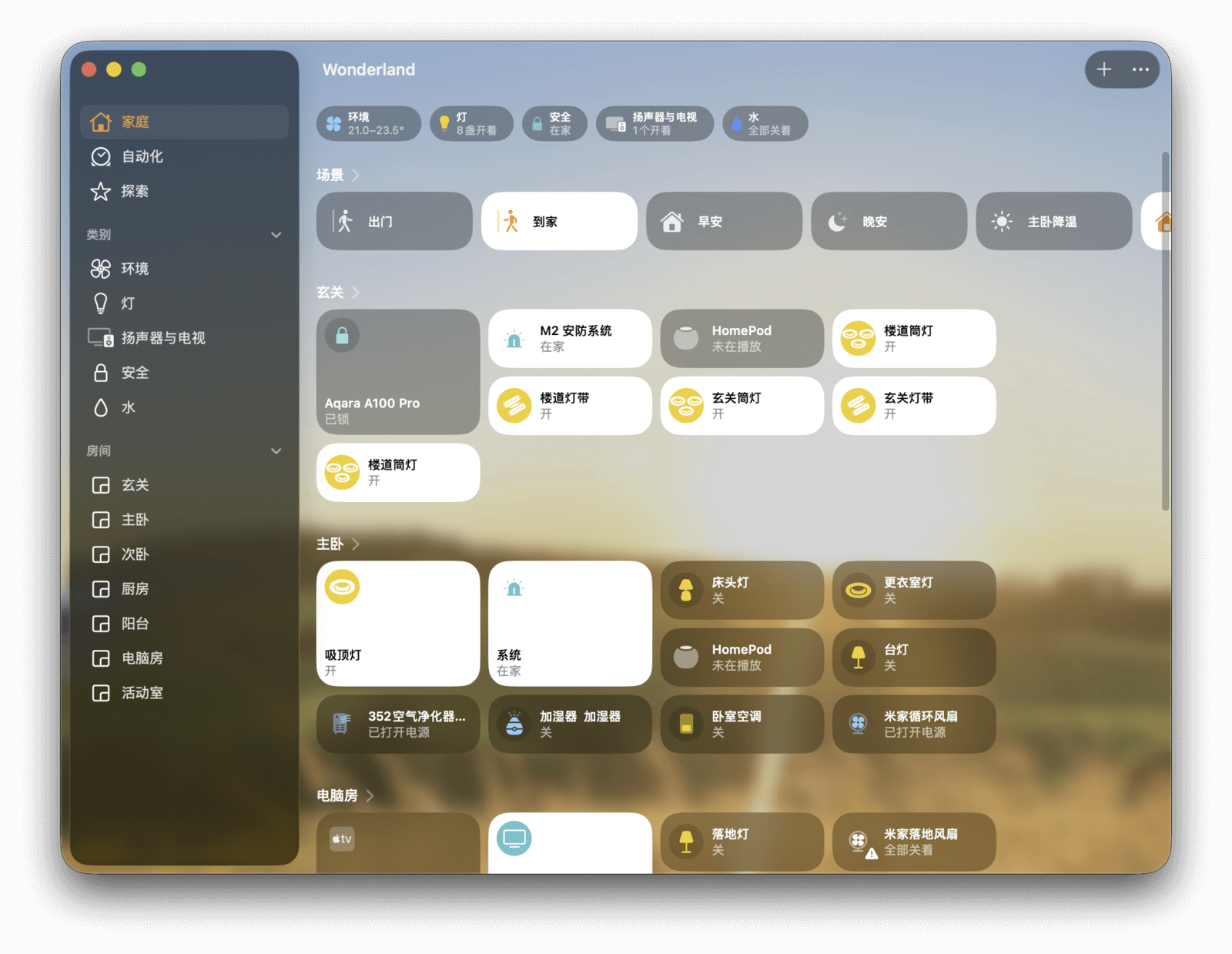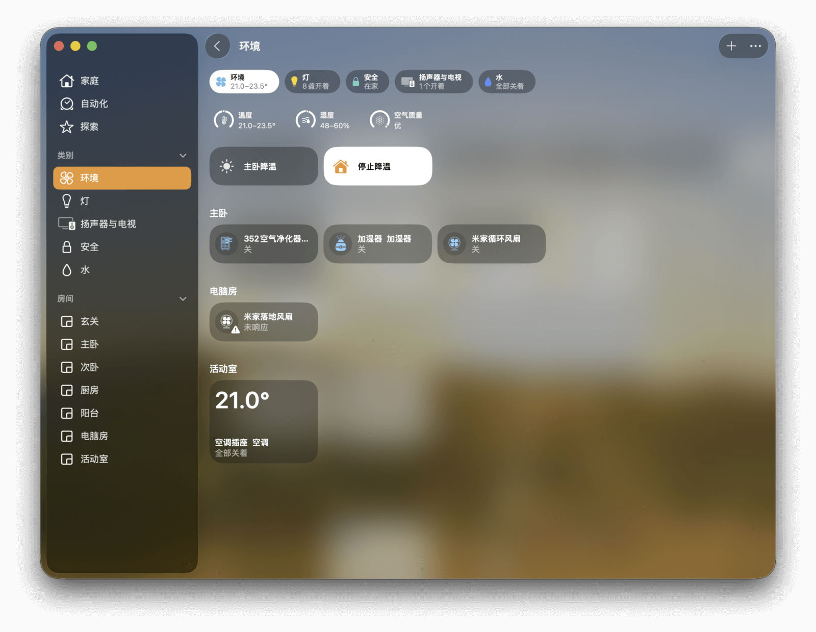 在 macOS 13 及之后版本中,家庭 app 的界面采用了全新的设计风格,从以往的底部标签页改成了侧边栏,令浏览、整理、查看和控制各种配件更加轻松简单。