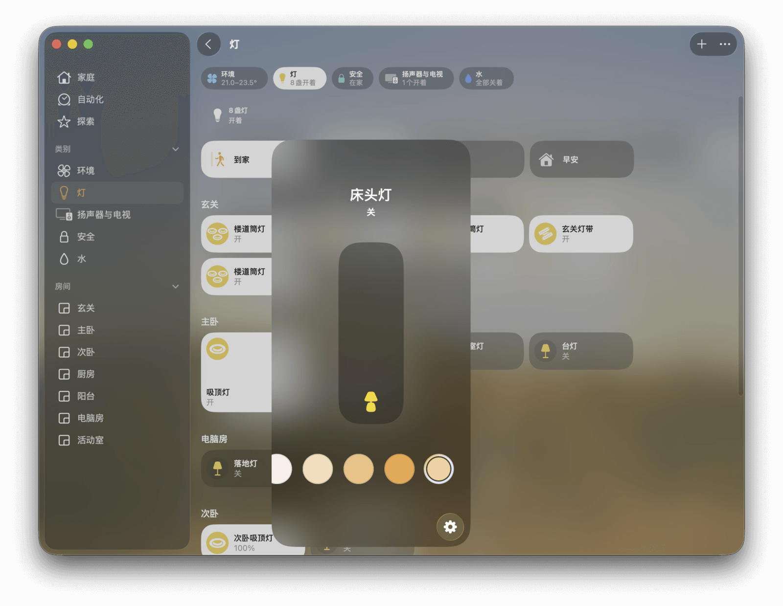 最后是「房间」分组。这里的信息与「家庭」页面类似,但只显示特定房间内的所有设备和场景。