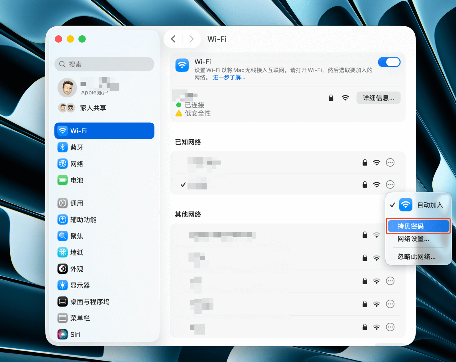 连接 Wi-Fi 后,我们常常会忘记密码。但在某些情况下,比如需要分享给他人,或是在其他设备上输入时,你可能会发现自己怎么也想不起来了。以往在 macOS 上查看 Wi-Fi 密码较为繁琐,但从 macOS 13 版本开始,操作变得非常简单。你可以在「系统设置 > 无线局域网」的已知网络列表中,找到想要查看的 Wi-Fi,然后点击旁边的「···」按钮并选择「拷贝密码」。