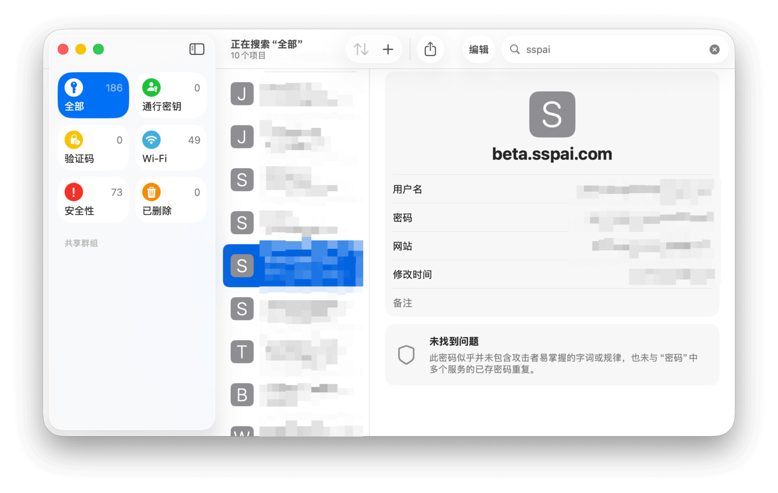 如果你在网站上更改了某个账户的密码,密码 app 会自动提示并帮助你更新其中保存的密码。你也可以手动修改账户信息:在密码 app 中选择你想要更改的账户,点击右侧详情页中的「编辑」按钮即可。若要删除一组账户密码,可以在选中它之后右键呼出菜单选择「删除」,也可以在编辑页面中点击「删除」按钮来完成。