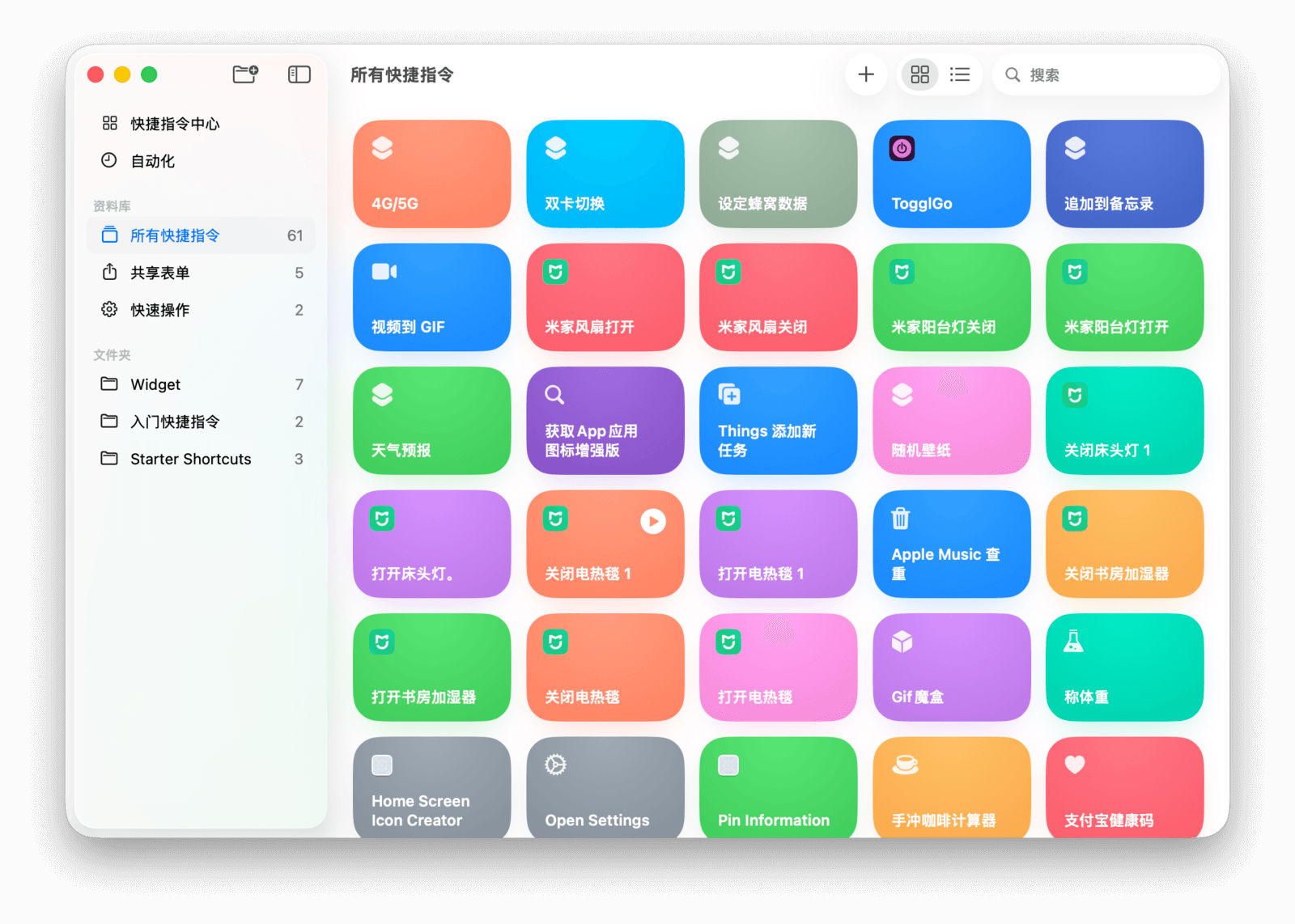 打开快捷指令应用,可以看到左侧边栏分为三个类别:快捷指令中心、快捷指令、文件夹。三者的基本界面如下所示,我们来逐一介绍。