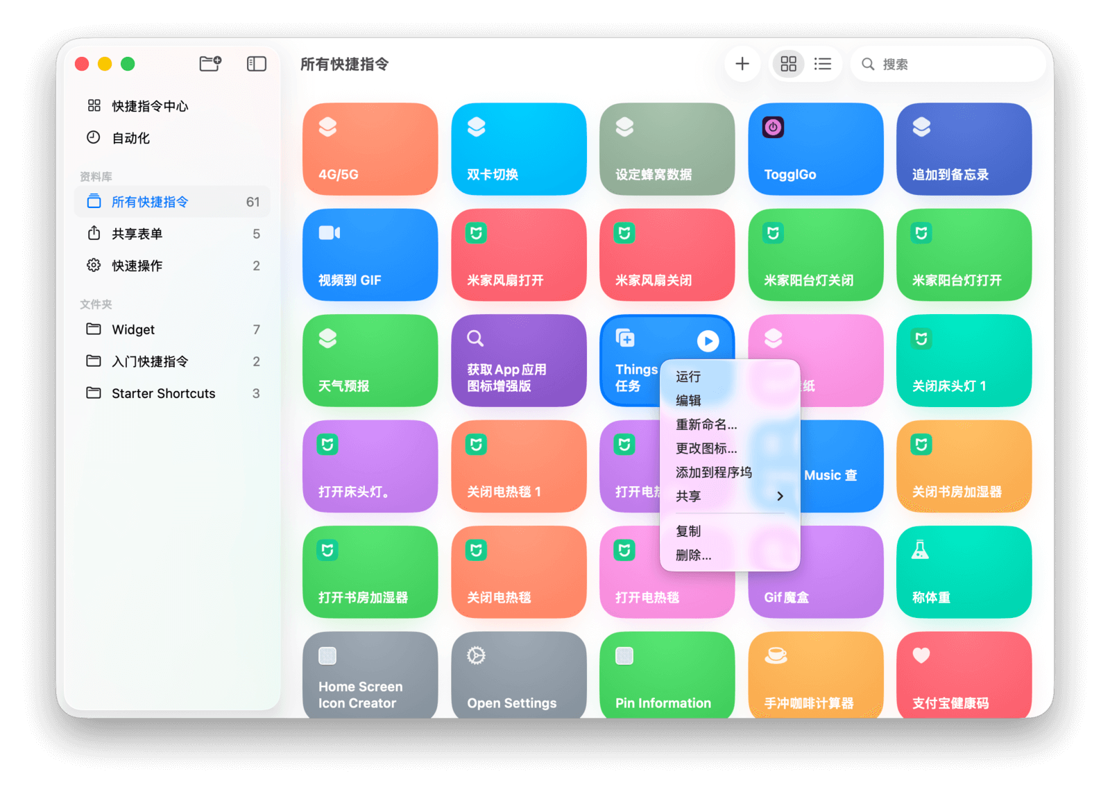 「快捷指令」页面存放着你所有的快捷指令,并按照触发入口分为「所有快捷指令」、「共享表单」、「快速操作」和「菜单栏」四个类别。在这个界面中,你可以按住并拖动快捷指令来调整其位置,或通过鼠标右键单击打开操作菜单。